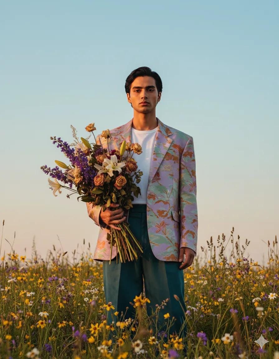 “A conceptual fashion photo, /my uploaded photo/ with vintage floral bouquet, straight-on angle, dressed in eclectic modern suit over designer tee. Wild grass and flowers surround him. Soft, gradient sky fading from light blue to peach. Delicate lighting wraps the scene.Createdu Using: Canon EOS R5, natural blacklighting, editorial art direction, runway-inspired ensemblea subtle HDR, silk-textured fabric, spring-themed color palette, minimalism meets high fashion. Preserve fave 100%