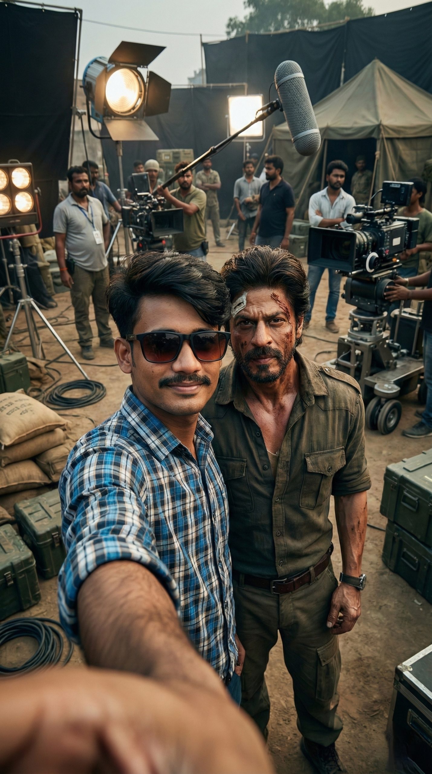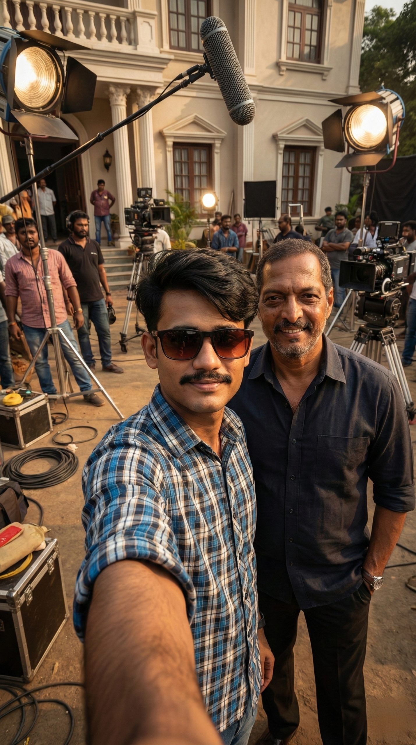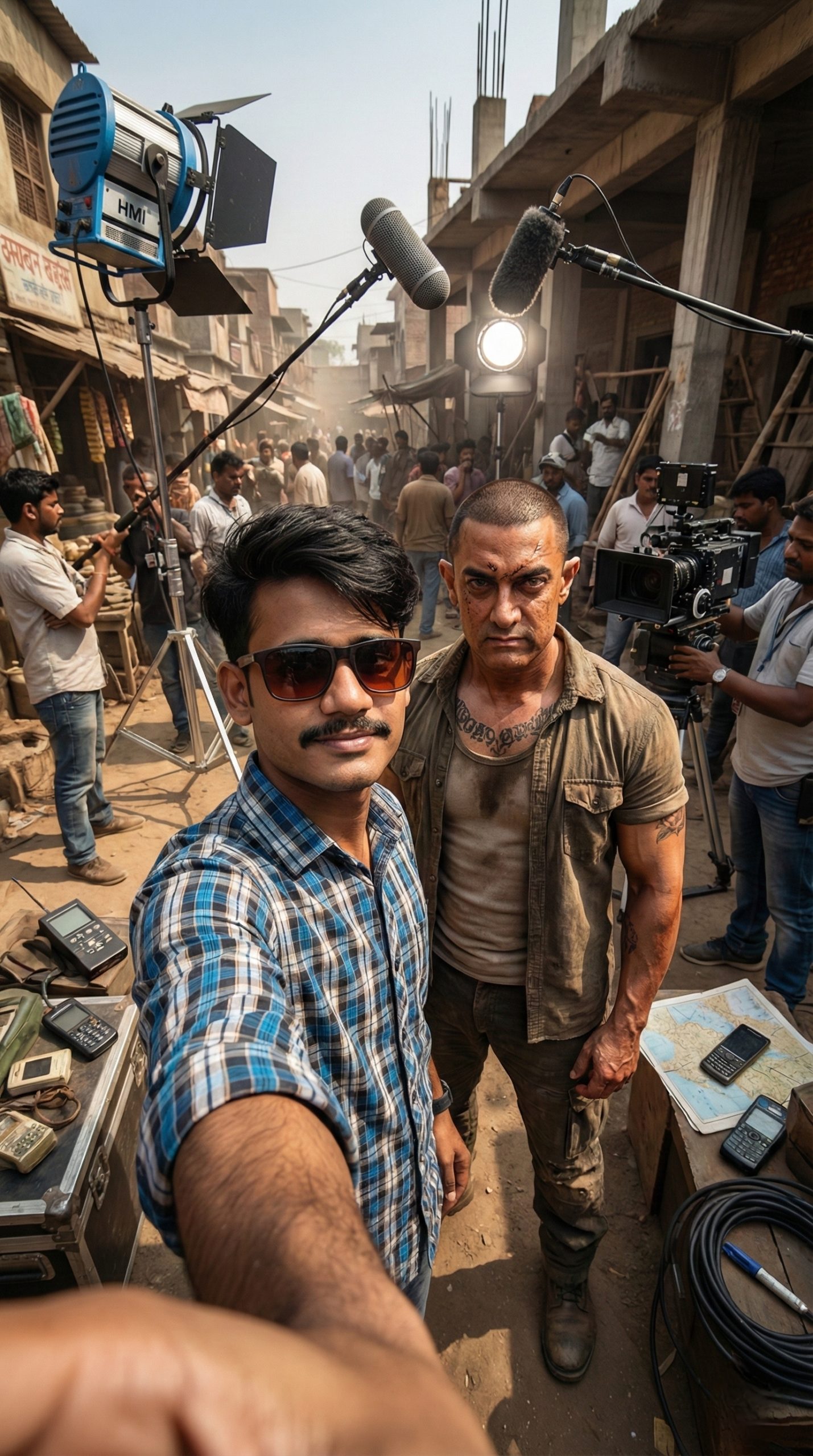 Location: shooting set (of the selected film outdoor/indoor), with characteristic surroundings and props reflecting the atmosphere of the scene.