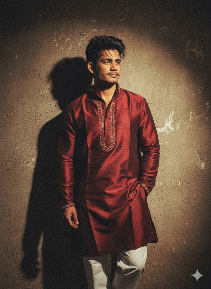 Create a full body retro vintage grainy but bright image of the reference picture styled in a classic traditional Indian kurta pajama.The outfit should be a rich, deep-toned kurta (like maroon or mustard) with subtle embroidery details, paired with crisp white details, paired with crisp white pajama. The look must feel like a 90s Bollywood hero aesthetic sharp, charismatic, and slightly romantic. Hair styled naturally with a soft wind brushing through, adding movement. The man is standing against a solid wall with deep shadows and dramatic contrast, he looks a soft left side but body straight & Right hands on pocket, evoking a mysterious yet artistic retro atmosphere. The overall vibe should feel timeless, cinematic, and culturally rooted Ratio 9:16