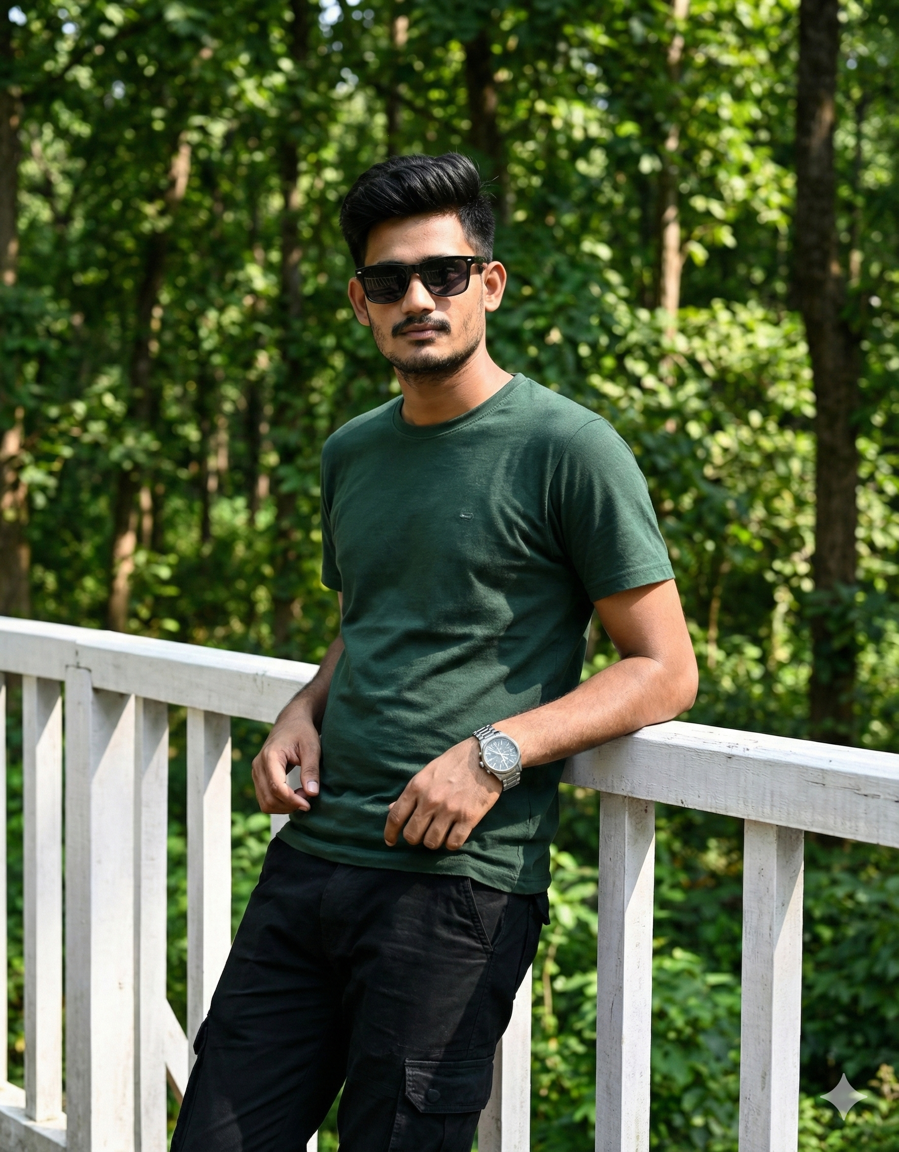 Convert 4k hd realistic potrait of a person (face same as uploaded) here’s a full shot of a slim handsome man in a dark green t shirt and black cargo leaning against a white railing, wearing sunglasses, and watch on wrist with a green forest background, captured in natural lighting